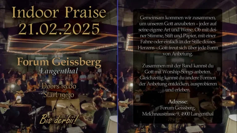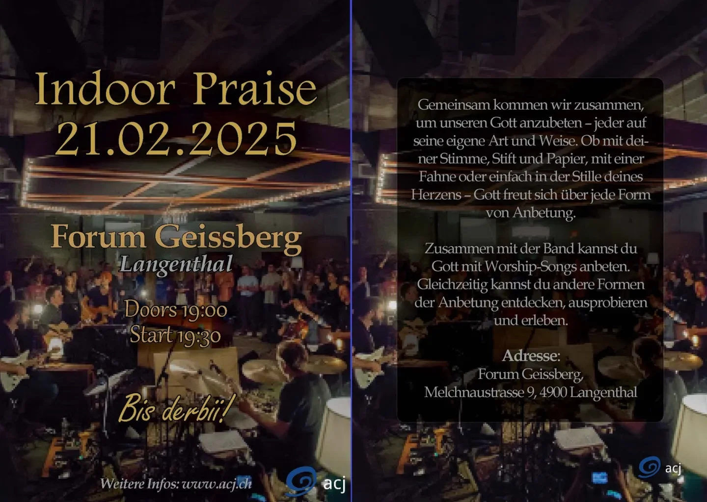 Das Indoor Praise Team gibt gerne weitere Auskünfte: david.hefti [at] acj.ch (david[dot]hefti[at]acj[dot]ch)